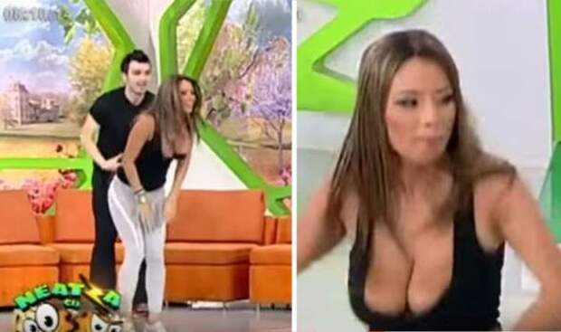 Пользователи интернета нашли еще одно видео с румынской ведущей прогноза погоды, случайно показавшей грудь в прямом эфире. На этот раз можно наблюдать, как девушка выполняет физические упражнения со своими коллегами. Ведущая прыгает вверх и вниз, то и дело поправляя свою кофточку.
