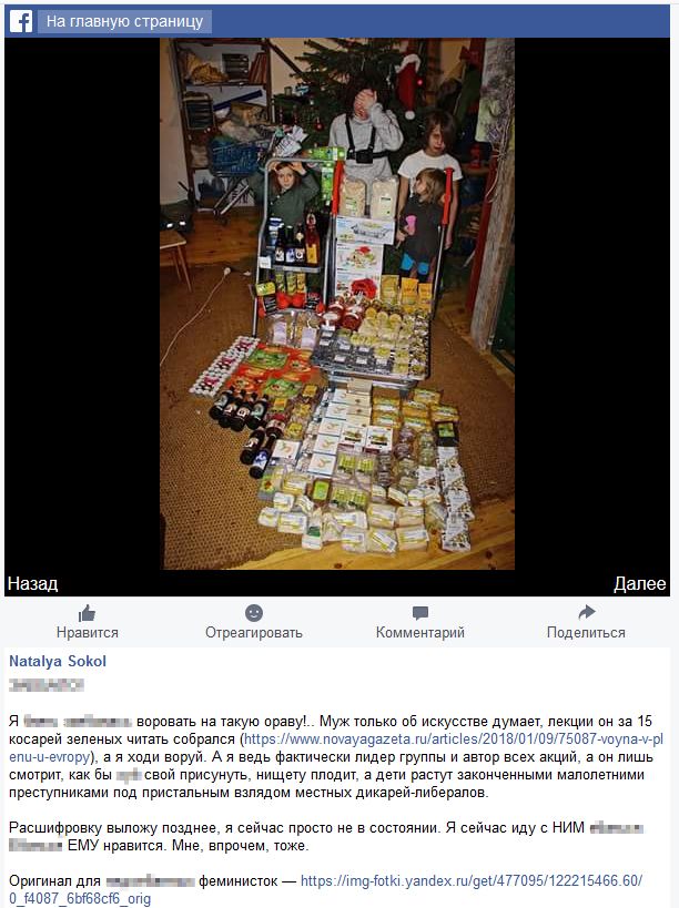 Участница арт-группы "Война" Наталья Сокол по прозвищу Коза заявила на своей странице в Facebook, что вынуждена воровать еду в супермаркетах, чтобы прокормить детей. Сокол и ее муж – лидер "Войны" Олег Воротников – еще в 2013 году уехали жить в Европу.