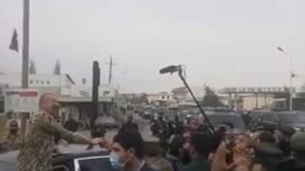 На кадрах люди аплодисментами приветствуют азербайджанского лидера, когда он покидает салон машины. Алиев в военной форме вместе с жителями скандирует "Карабах!