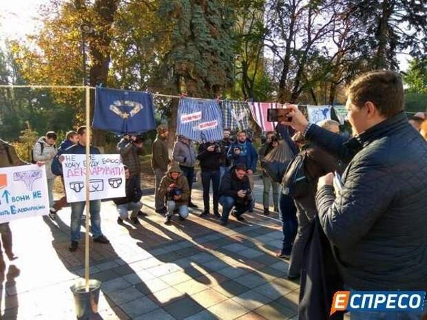 Утром во вторник протестующие развесили возле здания украинской Верховной рады "нижнее белье" с фотографиями депутатов, которые еще не заполнили электронные декларации.