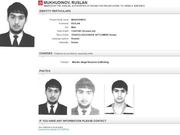 Международное ведомство обвиняет Мухудинова в убийстве и незаконном обороте огнестрельного оружия.