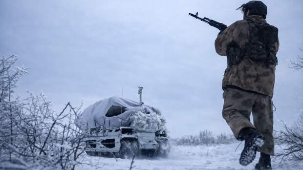 "Этот роботизированный комплекс ("Курьер". – Прим. РЕН ТВ) совершает выезды на передовую регулярно, особенно сейчас, когда местность окутал туман. Бойцам везут продукты", – говорит корреспондент Алексей Полторанин.