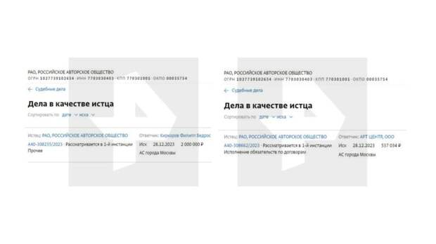 РЕН ТВ Кроме того, РАО также подало иск на сумму в два миллиона рублей к Филиппу Киркорову. Чем именно певец не угодил авторскому обществу, пока неизвестно.