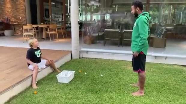 На кадрах Неймар с сыном тренируют отбивание мяча головой. Футболист бросает мальчику мячики от пинг-понга, и тот отбивает их головой.