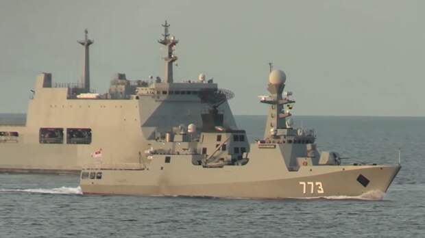 В ходе учений Россия представила отряд кораблей Тихоокеанского флота. В его состав вошли фрегат "Маршал Шапошников", корвет "Гремящий" и танкер "Борис Бутома".