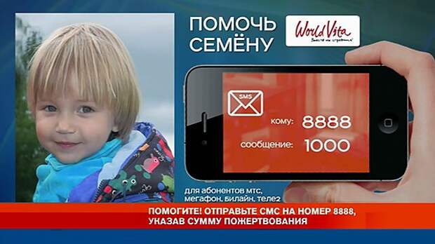 Помочь Семену Пескову можно прямо сейчас: достаточно отправить СМС с любой суммой (цифрами) на номер 8888. Указанная Вами сумма пожертвования будет списана со счета Вашего мобильного телефона.