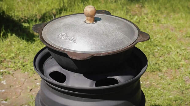 Большая деталь будет подставкой, меньшая станет печью для казана, в котором мы будем готовить наши кулинарные шедевры. Давайте их соединим. Свариваем обе детали друг с другом. Зачищаем швы болгаркой, обезжириваем конструкцию и покрываем черной огнеупорной краской из баллончика. Готово!