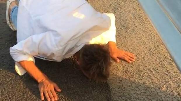 Как видно на кадрах, Панин ползает на четвереньках и целует объект, соединивший Крым и Краснодарский край.