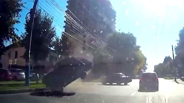 Приземление отечественной легковушки оказалось очень жёстким. К счастью, водитель, который совсем не планировал превращаться в пилота, отделался лёгкими ушибами.