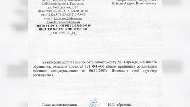 Глава администрации муниципального образования Толпуховское Владимирской области Ирина Абрамова рекомендовала депутату Собинского района Андрею Бойкову "расширить кругозор". Так она ответила на его жалобу на плохой ремонт. Кроме того, в своем обращении она перешла с депутатом на "ты".