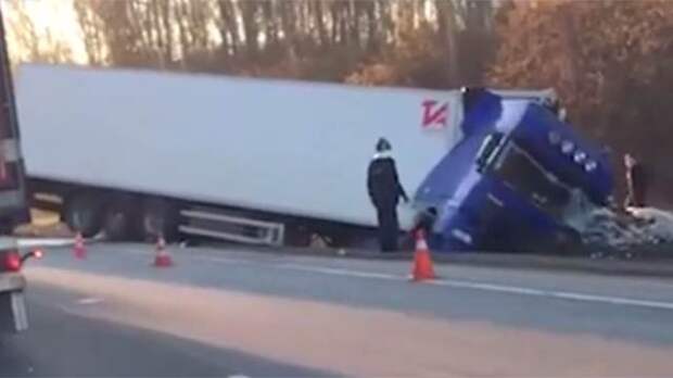 На кадрах видно, что на обочине справа лежит опрокинутая фура. В нескольких метрах от нее в кювете слева также оказался большегруз.