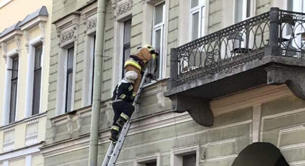 Как сообщает "Фонтанка", спасатели поставили лестницу к закрытому окну второго этажа, они пытаются выломать стеклопакет.