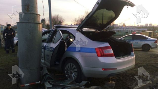 Как говорят очевидцы ДТП, водитель автомобиля ДПС не справился с управлением, задел два автомобиля, снес дорожный знак, вылетел на газон и боком врезался в столб.