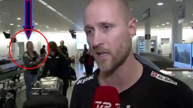 На видео журналисты берут интервью у мужчины в аэропорту. На заднем плане можно увидеть блондинку, которая стоит возле ленты выдачи багажа.