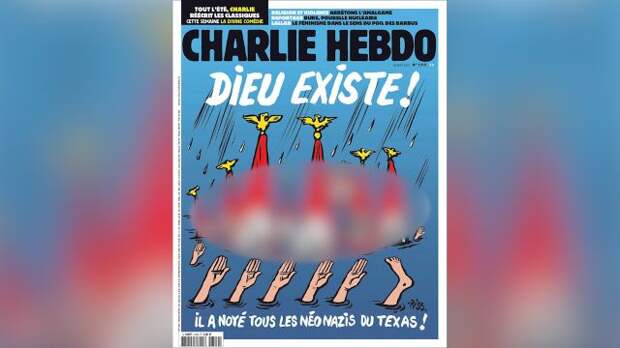 Французское издание Charlie Hebdo разместило на своей обложке карикатуру на жертв шторма "Харви" и вызванного им наводнения в американском Техасе. Фото обложки размещено в Facebook.