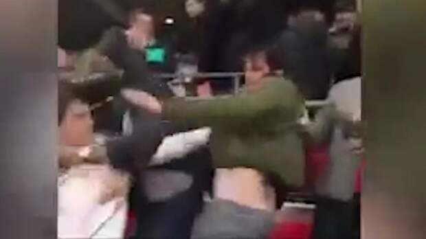 На кадрах ролика видно, что болельщики обмениваются ударами во время матча с участием сборных.