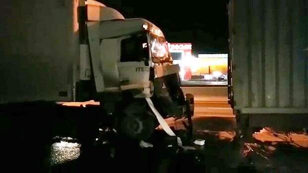После столкновения один из шоферов оказался заблокированным в салоне грузовика.