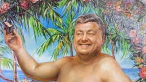 Заместитель главреда издания "Страна.UA" решила выставить на торги картину "Петр уже пятый", на которой запечатлен обнаженный Порошенко. Бывший глава государства предстает на полотне оголенным, прикрываясь лишь веточкой, пока вокруг него порхают стилизованные под эпоху Ренессанса херувимы.