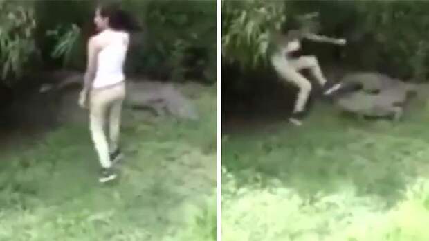 На YouTube появилось видео, на котором запечатлена молодая женщина, прыгнувшая в вольер к живому крокодилу.