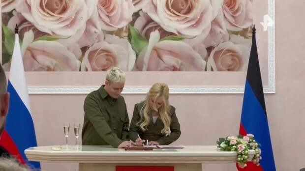 После этого они поставили подписи.Регистратор брака объявила их мужем и женой. Пара поцеловалась, от гостей прозвучали поздравления.