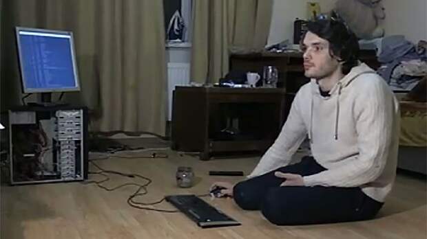 Ближе к концу репортажа появляется настоящий русский хакер.Итак, это москвич, взламывающий сайты даже не «на коленке», а на полу перед телевизором. Его логово полно зловещих артефактов: плюшевый бегемот, пивная кружка, пепельница из пустой банки. И главное – утюг на окне. Не иначе это знак, что явка провалена.