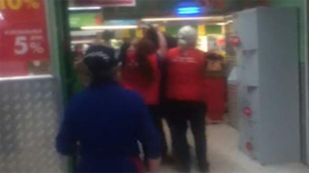 В Сети появилось видео, на котором запечатлено нападение на мужчину в магазине "Пятерочка". Кадры доказывают, что сотрудники этого магазина слаженно работают в команде: охранник, продавщицы и даже уборщицы принимали участие в борьбе против неугодного для них мужчины.