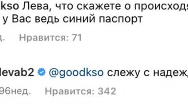 "Слежу с надеждой", - он ответил на комментарий в ответ на вопрос от подписчицы, намекнувшей на то, что Лева - обладатель белорусского паспорта.