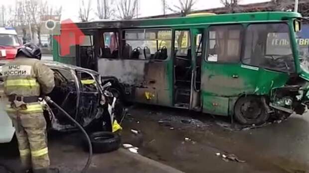 В Сети появилось видео последствий ДТП в Екатеринбурге, где загорелись легковушка и маршрутный автобус.
