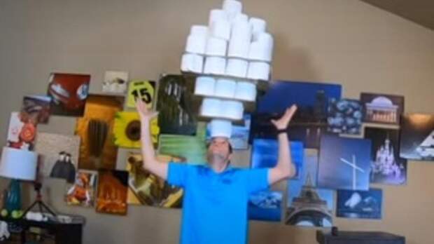Это, как он отметил, затрудняет достижение равномерного баланса.После нескольких неудачных попыток он решил остановиться на конструкции в форме перевернутой пирамиды, после чего смог поставить все 101 рулон и продержать их на голове.