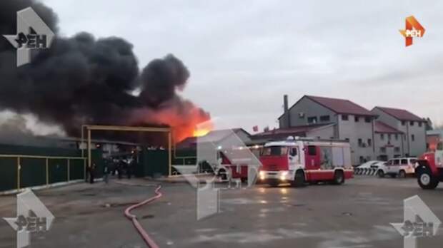 Металлический ангар охвачен пламенем — на месте происшествия постоянно раздаются хлопки. Огонь распространился на площади около 200 квадратных метров, произошло частичное обрушение кровли.