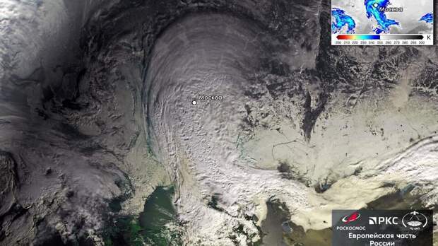 ИЗВЕСТИЯ/Эдуард Корниенко Роскосмос опубликовал спутниковый снимок мощного циклона "Валли", который обрушился на столичный регион в ночь на 19 февраля.
