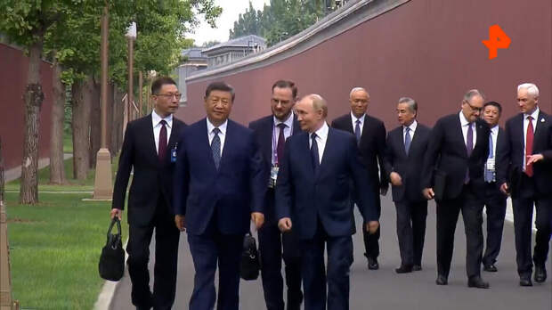 Президент России Владимир Путин и председатель КНР Си Цзиньпин прогулялись по резиденции "Чжуннаньхай" вместе с делегацией после переговоров в Пекине.