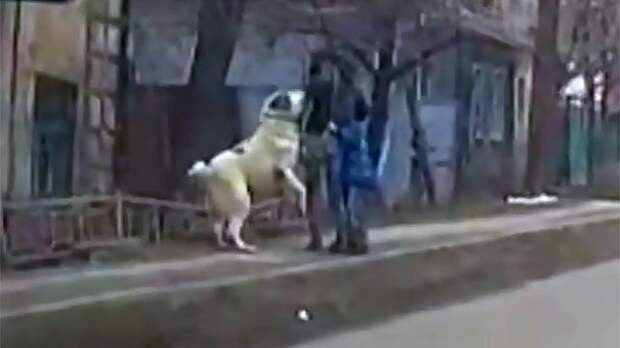В Воронеже полицейские проводят проверку после нападения огромного пса на женщину с маленьким ребенком. На видео видно, как животное встает на задние лапы, пытается укусить даму за шею. Мать закрывает сына своим телом, но собака набрасывается и на мальчика.