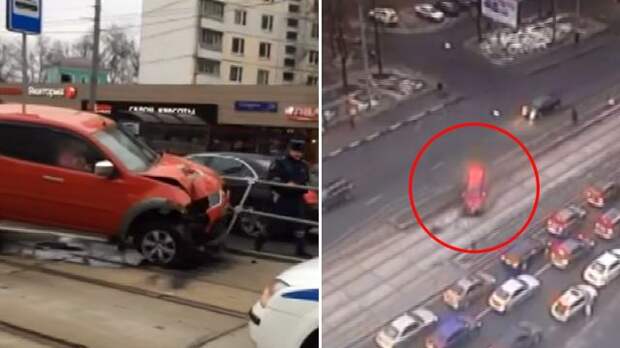 Появилось видео с камеры наблюдения, на котором запечатлено, как автомобиль "Мицубиси" протаранил трамвайную остановку в Москве. ДТП произошло на улице Русаковская.