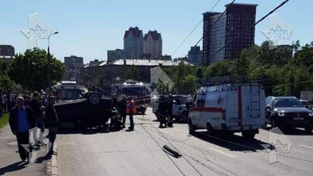 По данным РЕН ТВ, мачта освещения рухнула на Range Rover после того, как в нее врезалась другая машина. На кадрах с места происшествия видно, что внедорожник опрокинулся на крышу. По предварительной информации, водитель иномарки не пострадал.