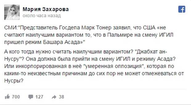 "Представитель Госдепа Марк Тонер заявил, что США не считают наилучшим вариантом то, что в Пальмире на смену ИГИЛ пришел режим Башара Асада. А кого тогда нужно считать наилучшим вариантом? "Джабхат ан-Нусру"? Она должна была прийти на смену ИГИЛ и режиму Асада? Или инкорпорированная в нее "умеренная оппозиция", которая по каким-то неизвестным причинам до сих пор не может отмежеваться от "ан-Нусры"?" — написала Захарова.