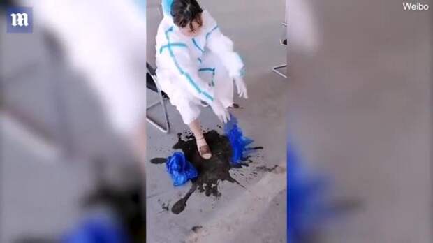 Ролик был снят в одной из больниц Китая. Врач присела передохнуть во время рабочего дня. Она снимает защитные чехлы на ногах, закатывает штанины и из них потоками льется пот.
