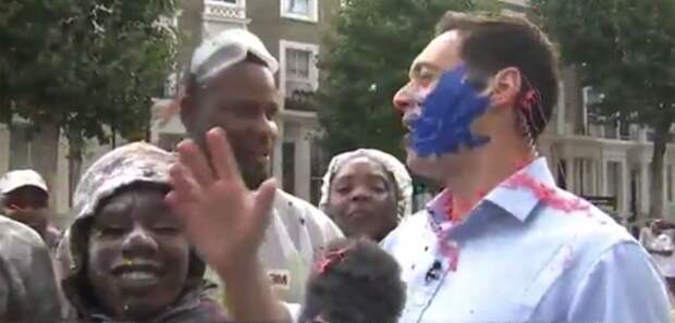 И напоследок один из участников шлепнул по лицу журналиста рукой с краской.