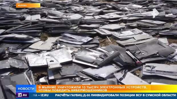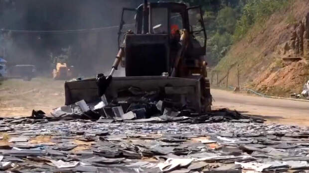 В Мьянме нашли неоднозначный метод борьбы с телефонными мошенниками, там под каток пустили 10 тысяч ноутбуков, планшетов, спутниковых станций и других электронных устройств.