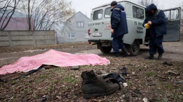 ДНР. Донецк. Сотрудники ритуальной службы забирают труп с улицы после обстрела в поселке Гладковка.