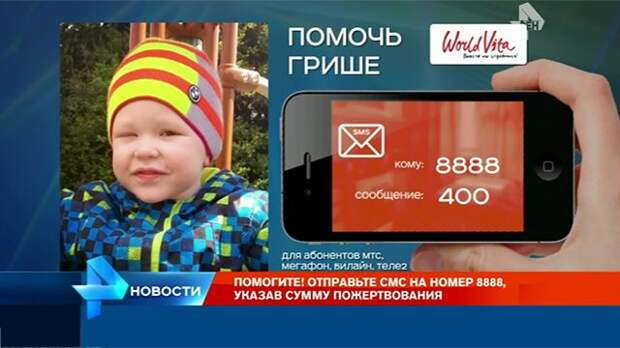 Помочь Грише видеть мир хотя бы одним глазом мы можем вместе. Всё, что сейчас нужно ребенку, — это ваше небезразличие. Для этого достаточно отправить сообщение на короткий номер 8888 и указать в нем сумму пожертвования — это может быть 100, 200 или 500 рублей. Средства сразу будут переведены на счет мальчика. Также вы можете прибегнуть к другим удобным для вас способам перечисления — например, воспользоваться кредитной картой, электронным кошельком или банковским переводом. Подробная инструкция, а также полный отчет о пожертвованных вами деньгах — на нашем сайте ren.tv. Спасибо всем тем, кто снова не остается равнодушным!