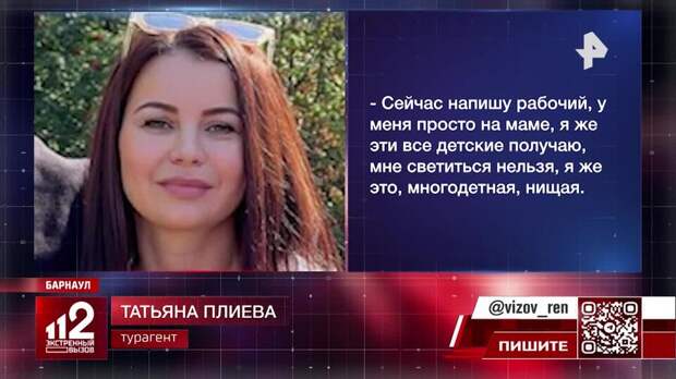 Так получилось и в этот раз, отпуск на сентябрь Анна оплатила еще в мае, 260 тысяч рублей за путевки перевела на банковскую карту матери Плиевой."Теперь уже к сожалению, что я не раз за лето не обратилась к ней, не написала, не побеспокоилась, и вот 25 уже августа, 3 сентября должен был быть вылет. 25 я написала, Таня, когда встречаемся, СМС не дошла, я уже забеспокоилась. 30 августа в субботу, она записала голосовое сообщение, что к сожалению отправить она нас никуда не может, так как деятельность у нее по каким-то причинам приостановлена", - заявила пострадавшая Анна Паршуковая.