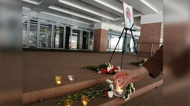 На ступенях центрального входа учреждения выставлена фотография Хворостовского с черной лентой.
