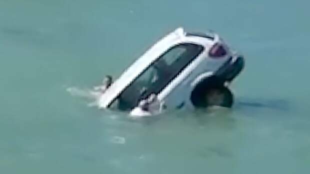 На кадрах видно, как очевидцы пытаются спасти людей, которые упали в воду на своем автомобиле.