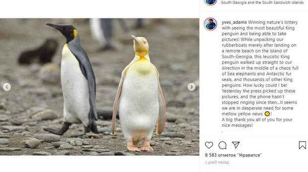 Бельгийскому фотографу Иву Адамсу удалось почти невозможное - он запечатлел животное, которое, возможно, является единственным в своем роде. Ив Адамс сфотографировал королевского пингвина, раскрашенного в белый и золотой цвета.