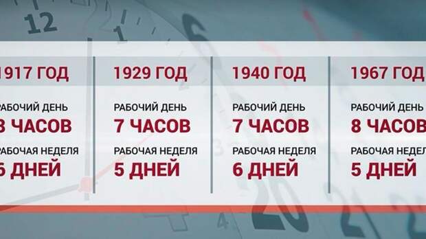 Скриншот видео На четвертый день после октябрьской революции вышел декрет о восьмичасовом рабочем дне. Рабочий день – восемь часов при шестидневной неделе.