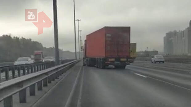 Неуправляемую фуру заметили сегодня на КАД в Петербурге. Грузовик совершал хаотичные маневры и врезался в отбойники. Один из участников движения снял происходящее на камеру и опубликовал видео на YouTube.