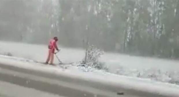 На кадрах видно, как мужчина в костюме коммунальщика косит траву во время сильного снегопада.