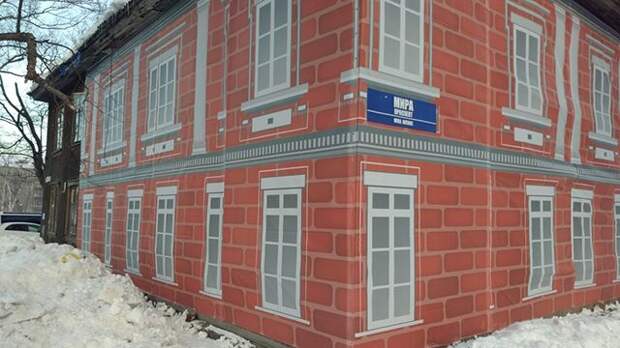 Как сообщает издание, "новый" дом появился напротив здания областного правительства. Деревянные стены ветхого жилья закрыли баннером с изображение кирпичной кладки.