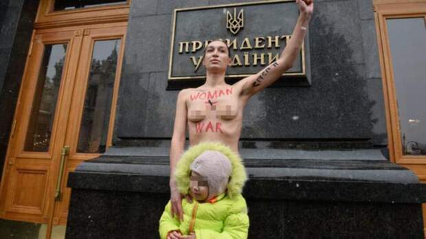 Девушка возле офиса главы украинского государства оголила интимную часть тела, держа на руках девочку.